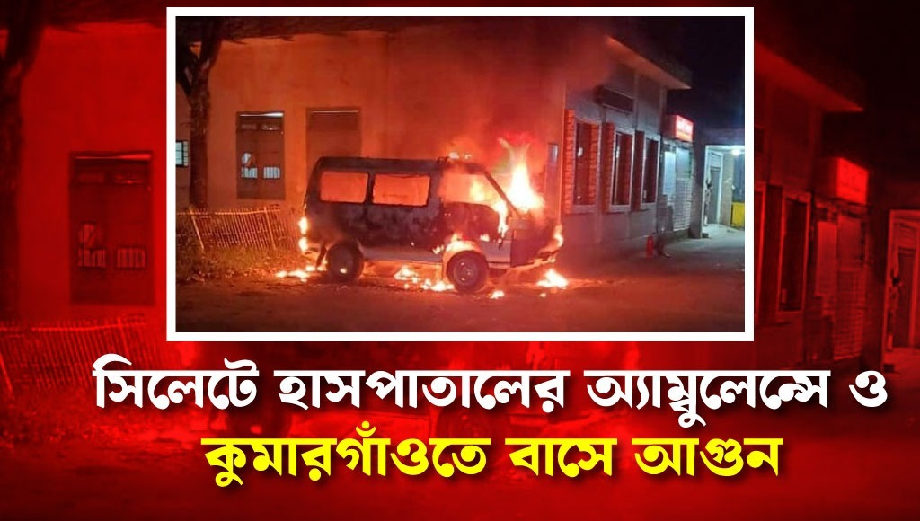 অ্যাম্বুলেন্সে আগুন লাগার এক ঘণ্টা পর সিলেট-সুনামগঞ্জ সড়কের কুমারগাঁও বাসস্ট্যান্ড এলাকায় হৃদয় পরিবহন নামে একটি বাসে আগুন দেওয়া হয়। বাসটি পরিত্যক্ত ছিল বলে জানিয়েছেন মহানগরীর জালালাবাদ থানার ভারপ্রাপ্ত কর্মকর্তা শাহ মোবাশ্বির। তিনি জানান, খবর পেয়ে পুলিশ আগুন নিয়ন্ত্রণে সহায়তা করে। পুলিশ বিষয়টি খতিয়ে দেখছে।