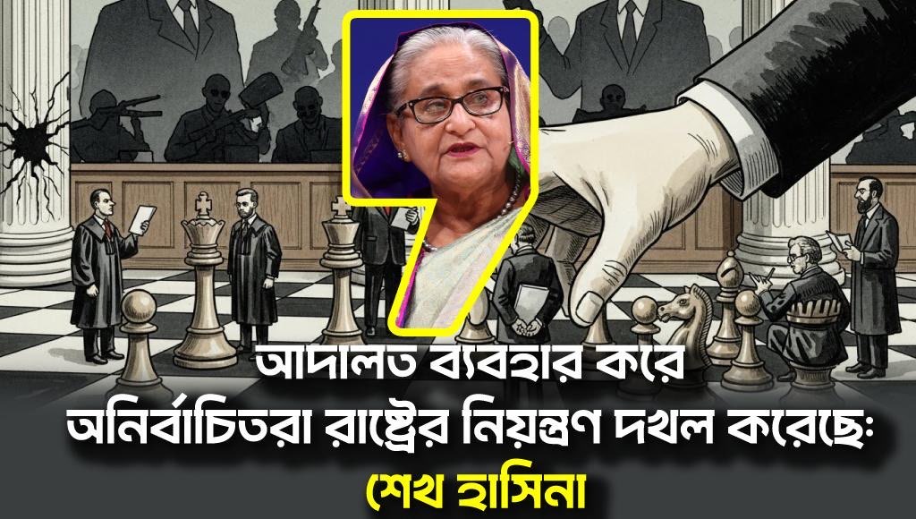 শেখ হাসিনা: এই অভিযোগগুলো আনা হয়েছে একটি ক্যাঙ্গারু কোর্ট-এর মাধ্যমে, যা আমার রাজনৈতিক প্রতিদ্বন্দ্বীদের একটি গোষ্ঠীর নিয়ন্ত্রণে রয়েছে। তারা অগণতান্ত্রিকভাবে ক্ষমতা দখল করেছে। স্বার্থপর ও অনির্বাচিত কিছু রাজনীতিবিদ রাষ্ট্রের নিয়ন্ত্রণ দখল করে আদালতকে ব্যবহার করছে আমাকে রাজনৈতিক প্রতিদ্বন্দ্বী হিসেবে সরিয়ে দিতে।