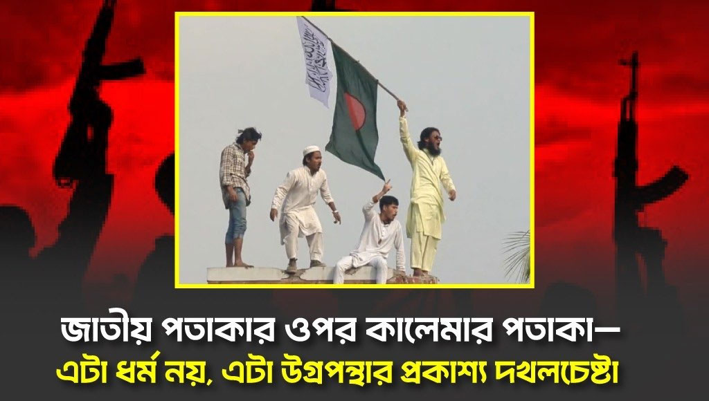 এটি কেবল ভাঙচুর নয়, এটি ইতিহাসে আঘাত, মুক্তিযুদ্ধকে অস্বীকার এবং সংবিধানকে পদদলিত করার নগ্ন প্রদর্শনী। রাষ্ট্রের পতাকার ওপরে কালেমা লেখা পতাকা বসানো মানে স্পষ্ট বার্তা— এটা জামায়াতি উগ্রপন্থার রাষ্ট্র দখলের মহড়া।