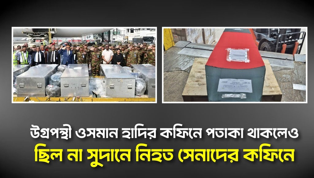 শনিবার সুদানে শান্তিরক্ষা মিশনে সন্ত্রাসী হামলায় নিহত বাংলাদেশি বীর সেনাদের মরদেহ যখন ঢাকায় পৌঁছায়, তখন এক হৃদয়বিদারক দৃশ্য দেখা যায়। দেশের জন্য জীবন দেওয়া এই সূর্যসন্তানদের কফিনে ছিল না কোনো জাতীয় পতাকা। অথচ একই দিনে আলোচিত ও বিতর্কিত সংগঠন ‘ইনকিলাব মঞ্চ’-এর মুখপাত্র ওসমান হাদির কফিনকে জাতীয় পতাকা দিয়ে মুড়িয়ে রাখা হয়। প্রশ্ন উঠেছে, রাষ্ট্রের জন্য জীবন উৎসর্গ করা সেনাদের চেয়ে কি একজন বিতর্কিত রাজনৈতিক কর্মী বড় হয়ে গেল?
