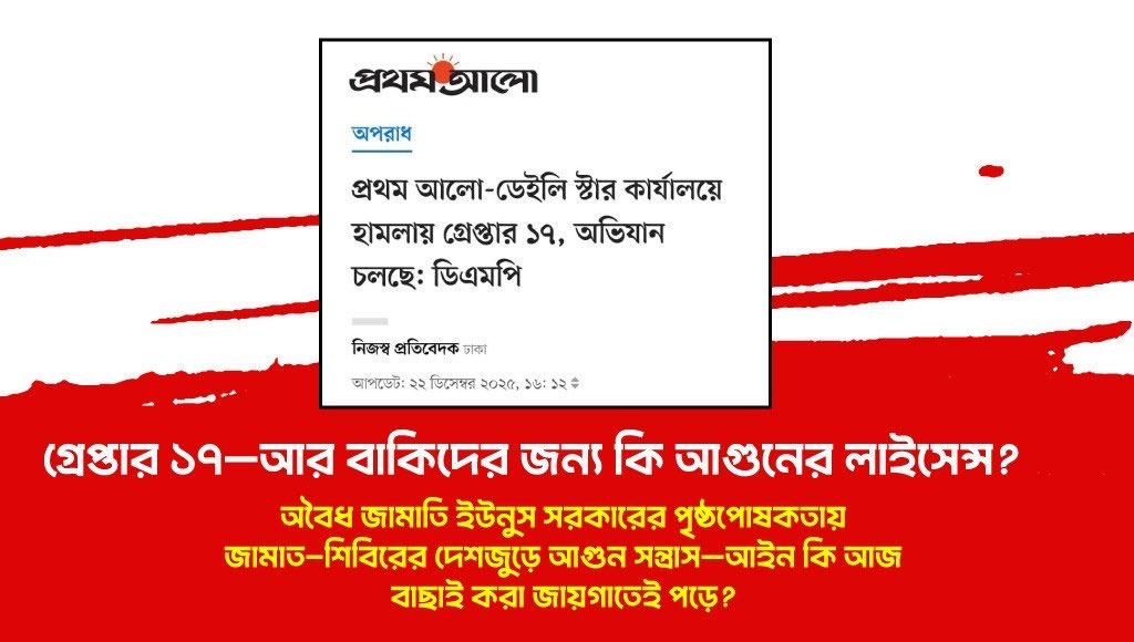 এই ঘটনাপ্রবাহ স্পষ্টভাবে দেখাচ্ছে—এটি কোনো বিচ্ছিন্ন সহিংসতা নয়, বরং সমন্বিত আগুন সন্ত্রাসের নীলনকশা। এই দ্বিমুখী আইনপ্রয়োগই অপরাধীদের আরও বেপরোয়া করে তুলছে। রাষ্ট্র যদি এখনই নিরপেক্ষ ও কঠোর অবস্থান না নেয়, তবে আগুন, ভাঙচুর আর মব সন্ত্রাসই দেশের নতুন “স্বাভাবিক” হয়ে উঠবে।