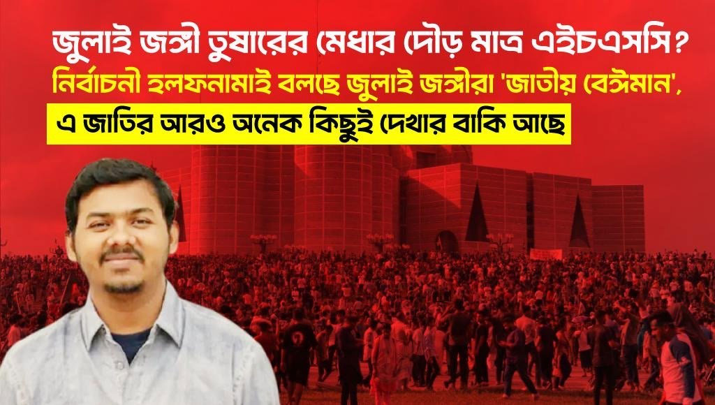 জুলাই ষড়যন্ত্রের জঙ্গীদের ভণ্ডামি ও আঙুল ফুলে কলা গাছ বনে যাওয়ার গল্পগুলো যেন উন্মোচিত হচ্ছে নির্বাচনী হলফনামাগুলোতেই। প্রথমেই আসি, নারীলিপ্সু-চরিত্রহীন জঙ্গী সারোয়ার তুষারের প্রসঙ্গে। একসময় টকশোগুলোতে হাঁটুর বয়সী বিতর্কে প্রচন্ড পান্ডিত্য দেখানো এই ফ্যাসিস্ট জঙ্গী তুষারের শিক্ষাগত যোগ্যতা এইচএসসি পাশ।