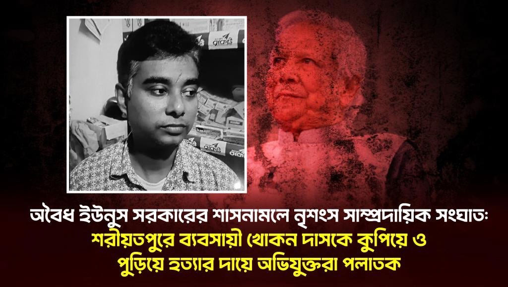 একজন সাধারণ ব্যবসায়ীকে কুপিয়ে এবং গায়ে আগুন ধরিয়ে পুড়িয়ে মারার এই ঘটনা ইউনুস সরকারের আমলে আইনশৃঙ্খলা পরিস্থিতির চরম অবনতিকেই নির্দেশ করে। খোকন দাসের এই মৃত্যু কেবল একটি হত্যাকাণ্ড নয়, এটি মানবিকতার ওপর এক চরম আঘাত। জঙ্গি সরকারের আমলে নিজেদের প্রাণ বাঁচানোই মুশকিল হয়ে পড়েছে দেশের সংখ্যালঘু সম্প্রদায়ের। শরীয়তপুরের ঘটনা আবারো আমাদের দেখিয়ে দিলো অবৈধ সরকার চায় দেশে জঙ্গিদের শাসন, যে শাসনে থাকবেনা কোন নৈতিক মূল্যবোধ বা নাগরিক অধিকার।