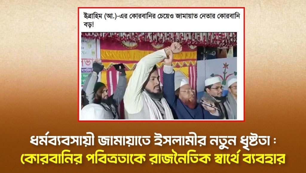 হজরত ইব্রাহিম আলাইহিস সালামের কোরবানি ছিল আল্লাহর প্রতি পরম আনুগত্যের এক অতুলনীয় প্রকাশ। নিজের সন্তানকে আল্লাহর হুকুমে উৎসর্গ করতে প্রস্তুত হওয়া কোনো সাধারণ ঘটনা নয়। এটি মুসলিম উম্মাহর জন্য চিরকালীন এক শিক্ষা, যেখানে মানুষ বুঝতে পারে যে সৃষ্টিকর্তার সন্তুষ্টির সামনে দুনিয়ার সব কিছু তুচ্ছ। কিন্তু রংপুরের এই জামায়াত নেতা সেই পবিত্র ঘটনাকে টেনে এনে নিজের দলীয় রাজনীতির সঙ্গে তুলনা করছেন। তিনি বলছেন, তার দলের জন্য একটি আসন ছেড়ে দেওয়া ইব্রাহিম আলাইহিস সালামের কোরবানির চেয়েও মহান। এই ধরনের কথা কি তাহলে কুফরি নয়? ইসলামের নবীদের মর্যাদাকে হেয় করে নিজের দলীয় স্বার্থকে বড় করে দেখানো কি ইসলামের শিক্ষা?