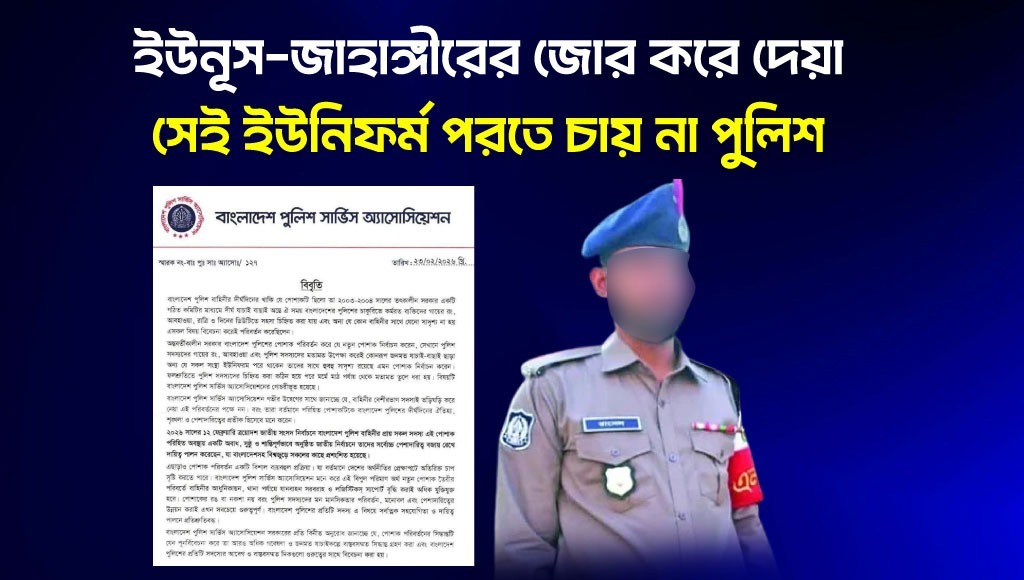 সাবেক অন্তর্বর্তী সরকারের প্রধান উপদেষ্টা ড. মুহাম্মদ ইউনূস এবং স্বরাষ্ট্র উপদেষ্টা জাহাঙ্গীর আলম চৌধুরীর নেওয়া পুলিশের ইউনিফর্ম পরিবর্তনের সিদ্ধান্ত নিয়ে তীব্র আপত্তি জানিয়েছে বাংলাদেশ পুলিশ সার্ভিস অ্যাসোসিয়েশন। সংগঠনটির দাবি, পুলিশ কর্মকর্তাদের সঙ্গে কোনো প্রকার আলোচনা বা যথাযথ পেশাদার মূল্যায়ন ছাড়াই এই পরিবর্তনের সিদ্ধান্ত ‘জোর করে’ চাপিয়ে দেওয়া হয়েছিল।