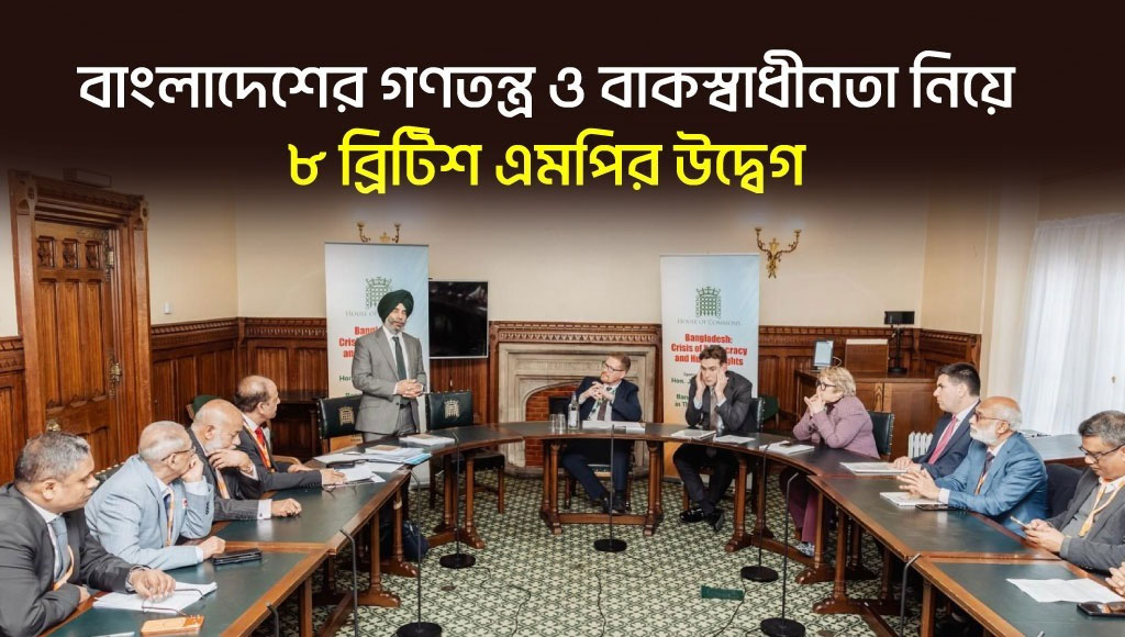 বাংলাদেশের গণতন্ত্র ও বাকস্বাধীনতা নিয়ে উদ্বেগ জানিয়েছে আটজন ব্রিটিশ সংসদ সদস্য। লন্ডনের হাউস অব কমন্সের ১৯ নম্বর কমিটি রুমে গত সোমবার (১৩ এপ্রিল) বাংলাদেশের বর্তমান রাজনৈতিক পরিস্থিতি, গণতন্ত্র এবং গণমাধ্যমের স্বাধীনতা নিয়ে এক বিশেষ আলোচনা সভা অনুষ্ঠিত হয়। ‘বাংলাদেশী ডায়াসপোরা ইন ইউকে’-এর উদ্যোগে আয়োজিত এই সভায় ব্রিটিশ পার্লামেন্টের আটজন সংসদ সদস্য (এমপি) অংশ নেন।