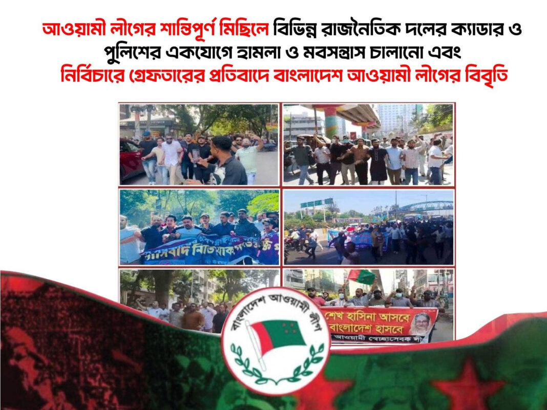 বিজ্ঞপ্তিতে আরও বলা হয়, বিএনপি-সহ বিভিন্ন রাজনৈতিক দলের ক্যাডাররা পুলিশের যোগসাজশে এই মবসন্ত্রাস চালাচ্ছে। একইসঙ্গে পুলিশ আহত আওয়ামী লীগ নেতাকর্মীদের নির্বিচারে গ্রেফতার করে আতঙ্কের পরিবেশ সৃষ্টি করছে এবং রাজনীতির সুষ্ঠু পরিবেশ বিনষ্ট করছে। এই হামলা ও গ্রেফতারের মাধ্যমে রাষ্ট্রযন্ত্রের প্রত্যক্ষ মদদে রাজনৈতিক প্রতিহিংসা চরিতার্থ করার চেষ্টা চলছে, যার উদ্দেশ্য দেশে অরাজকতা সৃষ্টি এবং জনগণের জানমালকে বিপন্ন করে রাজনৈতিক ফায়দা হাসিল করা।
