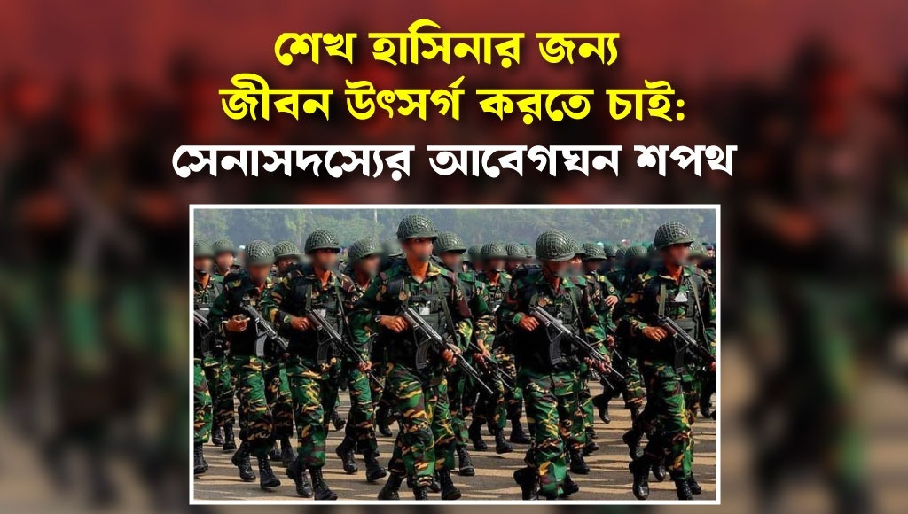 প্রধানমন্ত্রী শেখ হাসিনার প্রতি গভীর আনুগত্য ও ভালোবাসা প্রকাশ করে জীবন উৎসর্গ করার শপথ নিয়েছেন এক সেনাসদস্য। সামাজিক যোগাযোগ মাধ্যমে ছড়িয়ে পড়া এক আবেগঘন ভিডিওতে তাকে এই অঙ্গীকার করতে দেখা যায়। ক্যামোফ্লেজ প্যান্ট ও কালো বুট পরিহিত ওই ব্যক্তির heartfelt বক্তব্যটি দ্রুতই মানুষের মনে নাড়া দিয়েছে।